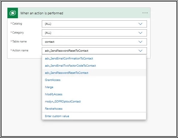 Furthermore, select the Dataverse connector and choose the “When an action is performed” trigger, specifying relevant parameters.