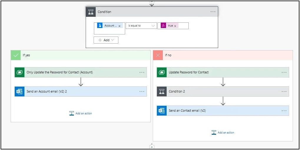 So, apply conditional statements within the child flow to differentiate between password reset requests for accounts and contacts. This logic enables the flow to execute appropriate actions based on the account type, ensuring accurate password updates and email dispatches: